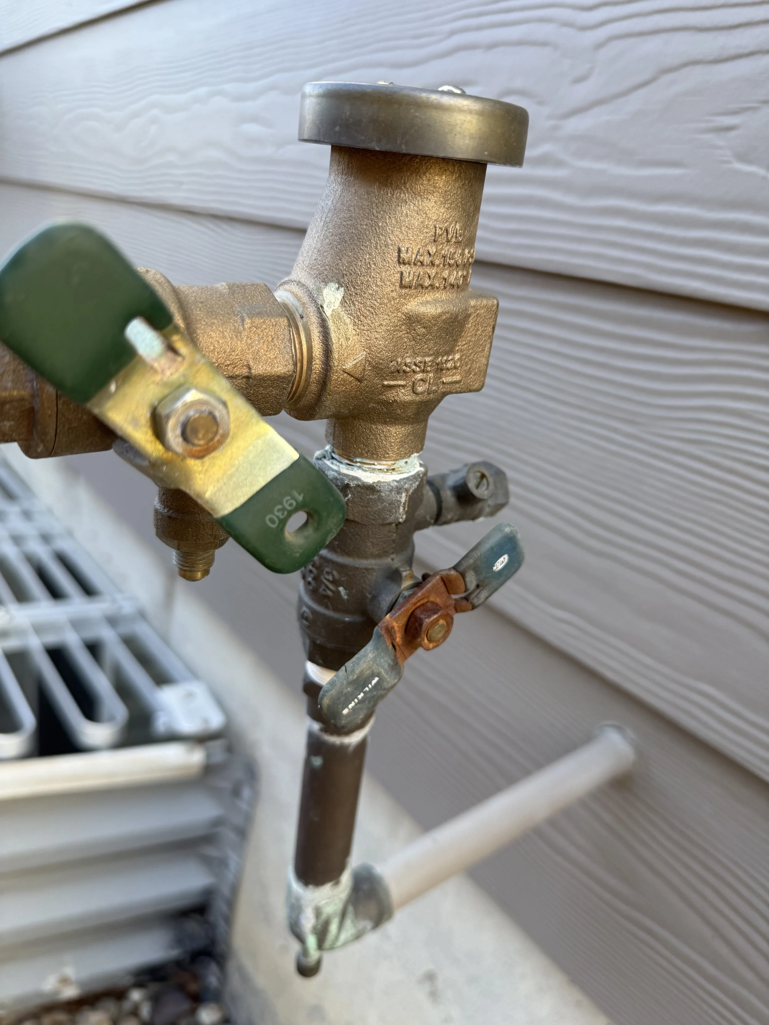 Notice how all valves (and test-ports) have been turned to 45 degrees to allow PVB to drain and prevent freezing.